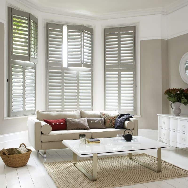 Bright living room featuring white plantation shutters, a cream sofa, and decorative pillows, creating a light and inviting space.